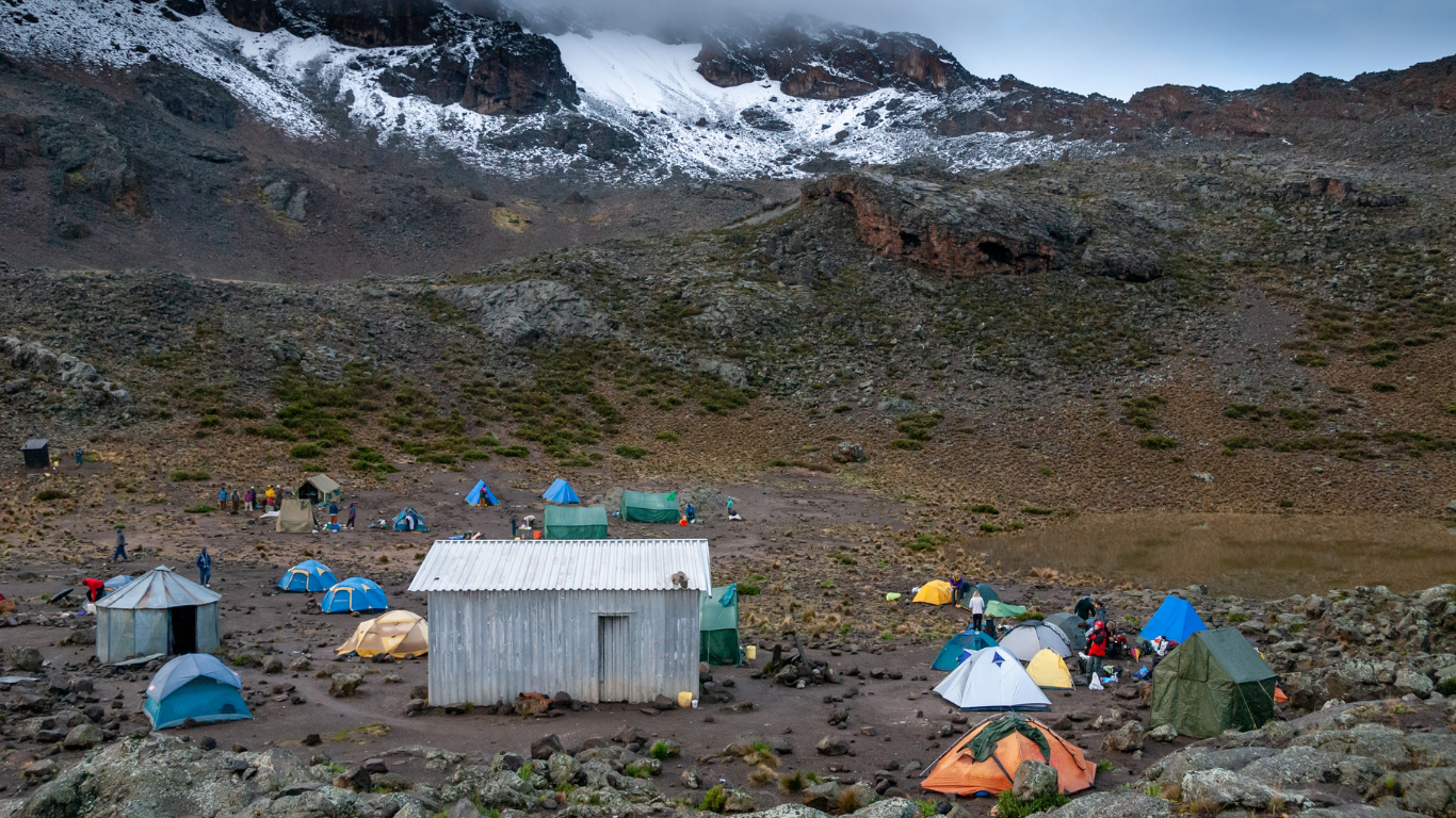 Efter frukost fortsätter vandringen mot Mawenzi Tarn Hut (4 330 m), med lunch på vägen. Från lägret väntar en fantastisk utsikt mot Kibo, ert slutmål på Kilimanjaro. Dagens etapp är kort men brant, uppför en gräsbevuxen sluttning, och erbjuder storslagna vyer över vildmarksområdet. När ni lämnar hedzonen och stiger in i Alpine Desert förändras landskapet dramatiskt – vegetationen blir sparsammare och omgivningarna mer karga. Campen ligger vid foten av de taggiga spetsarna av Mawenzi, vid Mawenzi Tarn, där ni övernattar i tält. Efter ankomst på tidig eftermiddag kan ni vila, ta det lugnt eller utforska området. Dagens vandring erbjuder jämn stigning och magnifik utsikt över de östra glaciärerna samt Kibo, den högsta av de tre vulkantoppar som utgör Kilimanjaro. Vid klart väder och sol kan sommarkläder fortfarande bäras under dagen. Middag serveras på campen, och ni kan njuta av lugnet och storslagenheten i högalpin miljö.